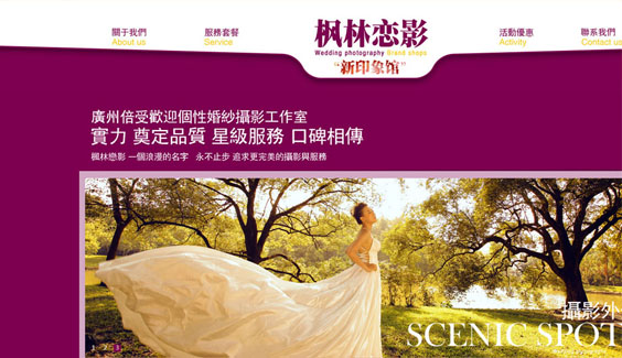 楓林戀影是廣州知名的婚紗攝影工作室,一個在廣州婚紗攝影中擁有良好口碑的品牌,以化妝的精致、婚紗的個性與時尚、和與眾不同的拍攝方式,贏得每對新人的贊許,成為廣州婚紗攝影的倡導者。專業(yè)的服務團隊,一流的攝影設備,不管時尚、浪漫、古典、個性、唯美...楓林戀影的專業(yè)攝影師都能讓你獲得意外的驚喜。