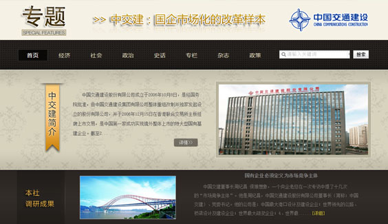 負(fù)責(zé)中國交建專題頁面的設(shè)計制作,該頁面以黑色為主色調(diào),加以棕、黃為點綴加以突出,符合企業(yè)特點,體現(xiàn)企業(yè)沉穩(wěn)、安全、實力雄厚。整個設(shè)計,簡潔,大方,彰顯企業(yè)實力。