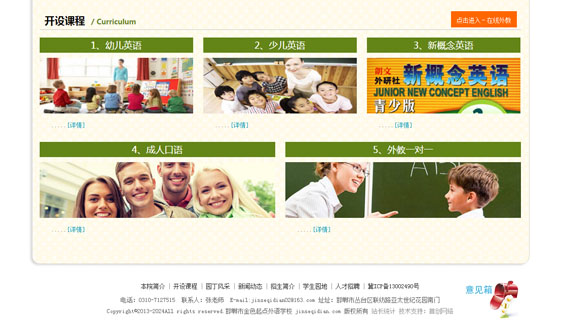 負責邯鄲市金色起點外語學校網(wǎng)站設計制作開發(fā)等網(wǎng)站建設服務,金色起點是一所面向兒童的外語高級培訓學校,故網(wǎng)站設計時注重活潑、可愛、時尚等特點,金色起點網(wǎng)站設計以藍色為主打系,黃色為輔助色系,采用先進的動態(tài)flash技術使整個網(wǎng)站生動、形象、活潑等,結(jié)合學校的特點,以黃色為點輟,襯托年輕、成長、可愛的的學習畫卷。