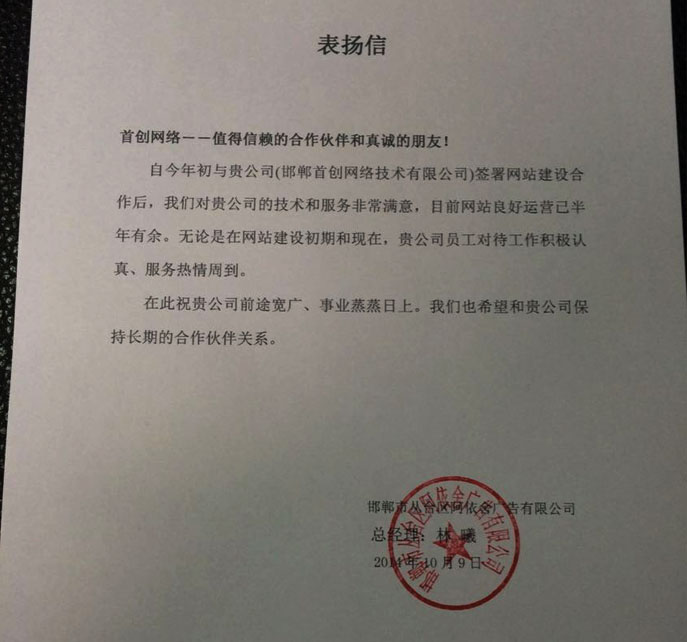 自今年初與貴公司(邯鄲首創(chuàng)網(wǎng)絡技術有限公司)簽署網(wǎng)站建設合作后,我們對貴公司的技術和服務非常滿意,目前網(wǎng)站良好運營已半年有余。無論是在網(wǎng)站建設初期和現(xiàn)在,貴公司員工對待工作積極認真、服務熱情周到。